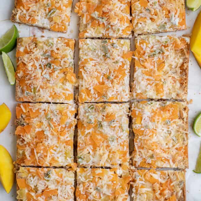 These tropical cookie bars are sure to hit the sweet spot. They're the perfect snack to bring to potlucks and parties or to give as homemade gifts. They're so simple to make that you can have a batch ready in a cinch. Prepare the crust, layer the toppings, and pop them in the oven until golden yet soft and chewy. Easy peasy 🙂